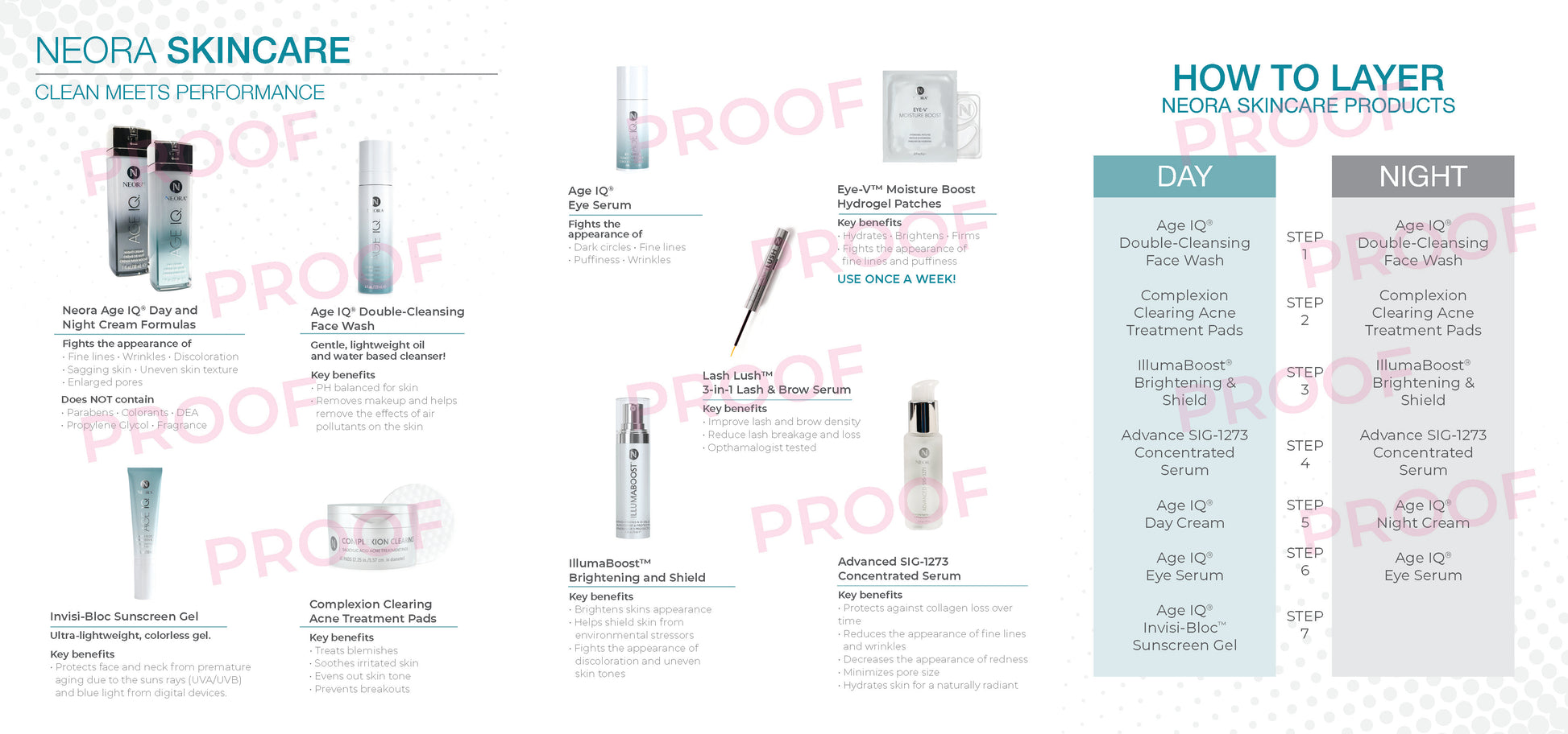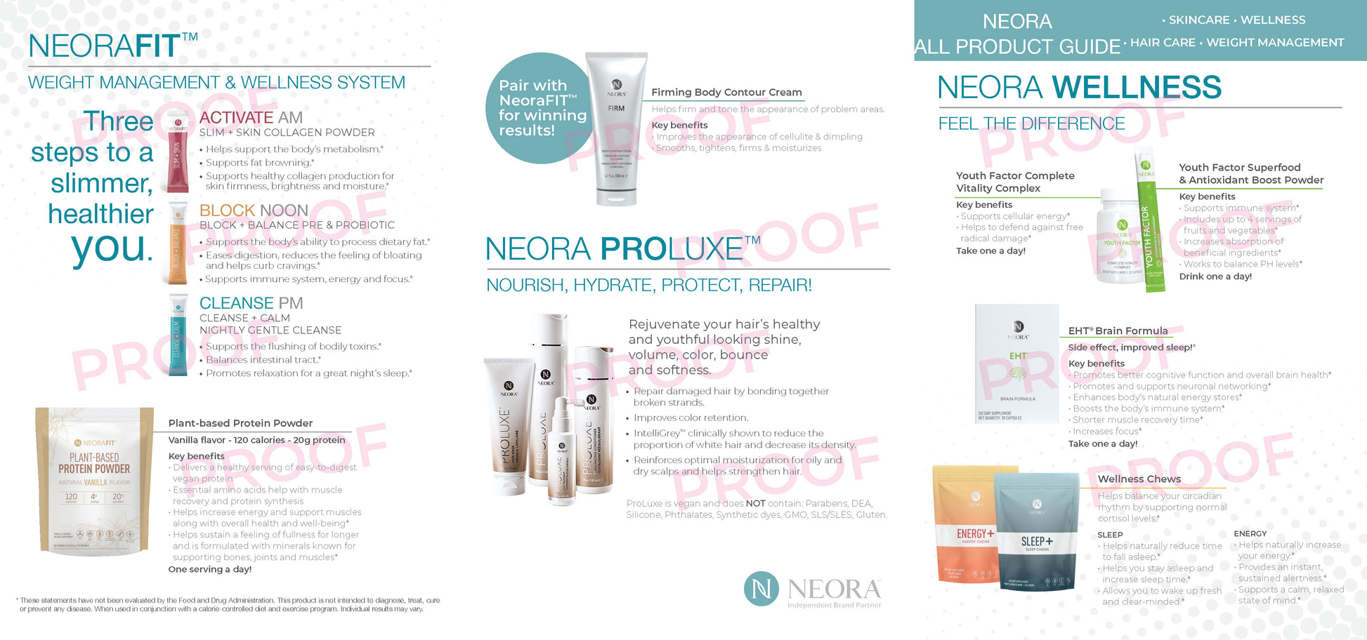 5 inch by 7 inch, high resolution, glossy tri-fold brochure containing descriptions for all products offered by Neora.