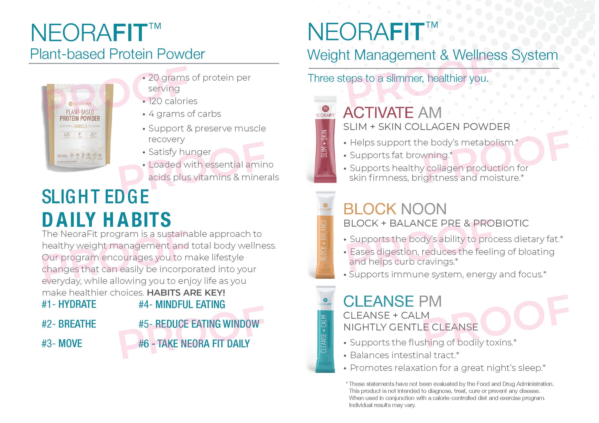4.25 inch by 6 inch, high resolution, glossy, folded brochure containing descriptions for NeoraFit Weight Management & Wellness System. Includes interior page for tracking progress.