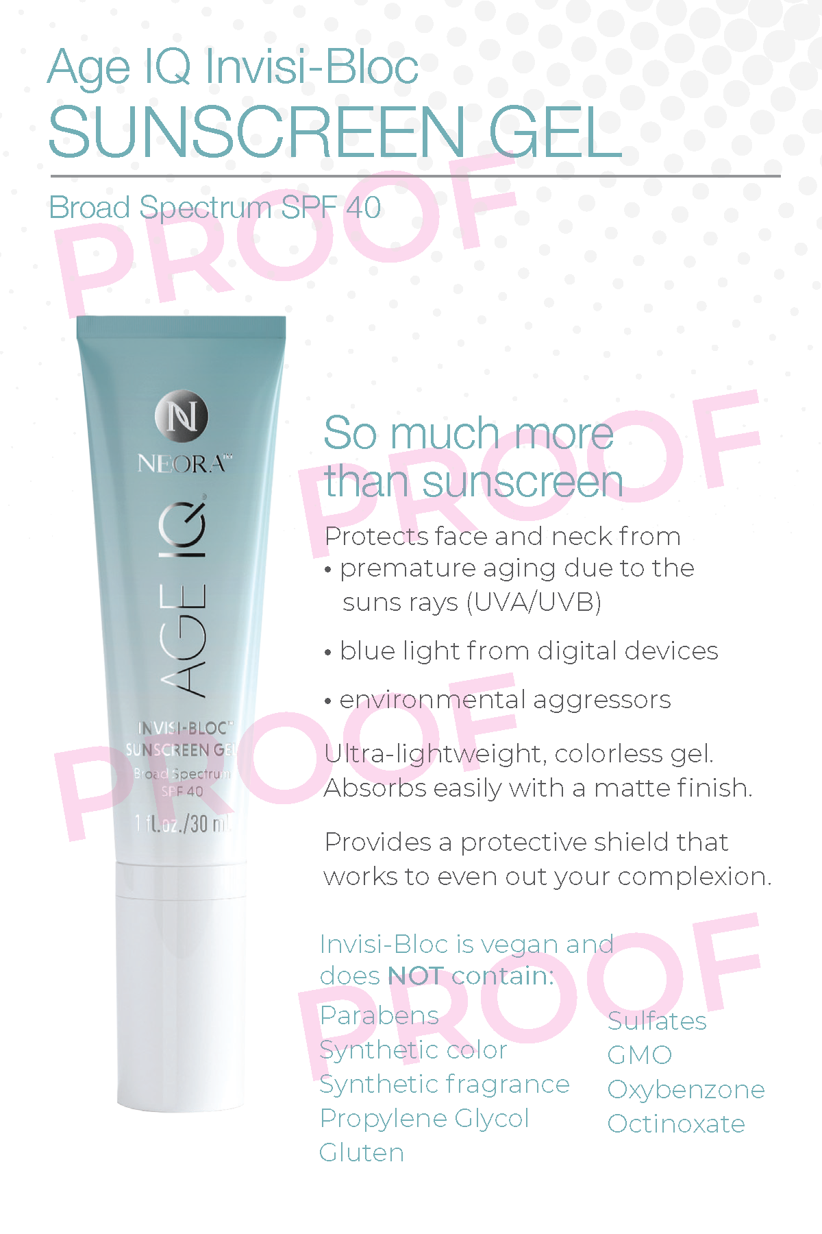 4 inch by 6 inch glossy high-resolution product card for Age IQ Invisi-Bloc Sunscreen Gel & Acne Treatment Pads.